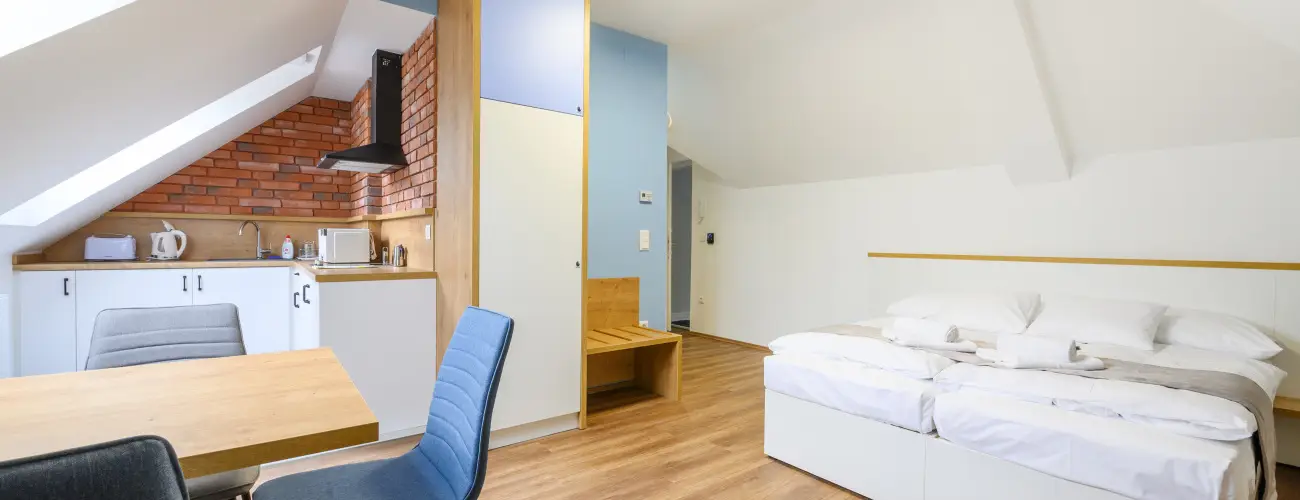 Egy-, kettő-, három hálószobás apartmanjaik zuhanyzós fürdőszobával, amerikai konyhával és erkéllyel rendelkeznek.